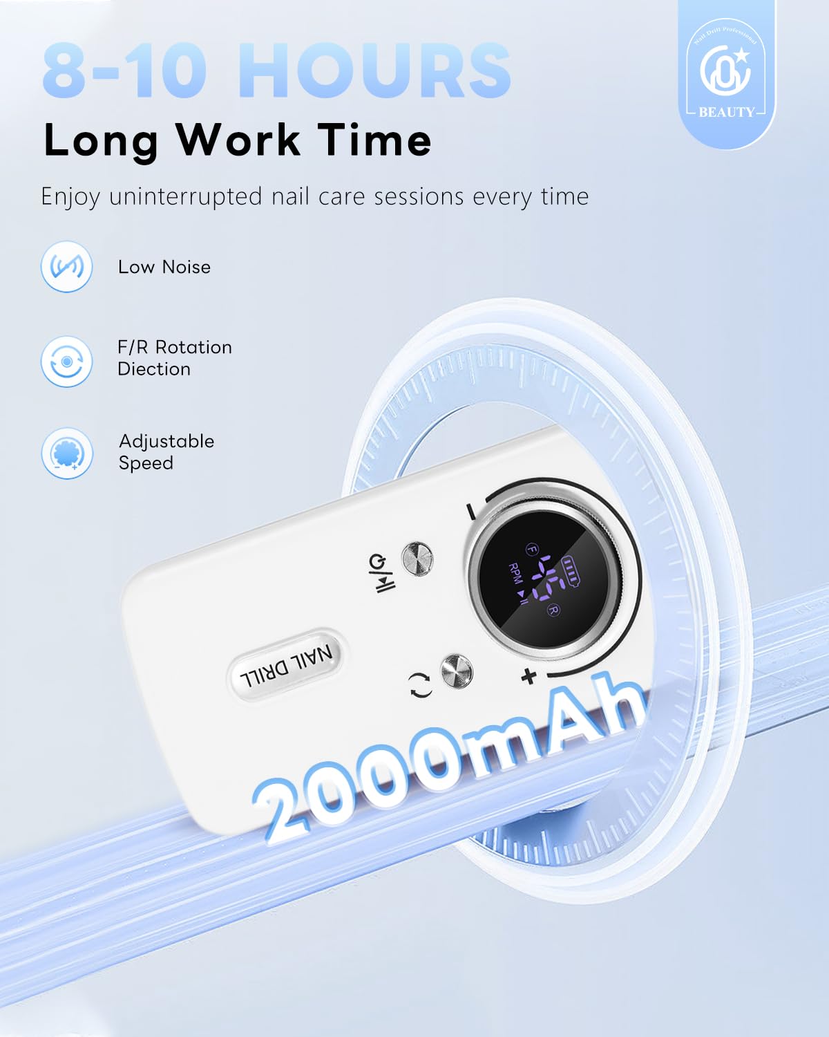 - 【8-10 Hours Long Work Time】Enjoy uninterrupted nail care sessions with our rechargeable nail drill, offering an impressive 8-10 hours of continuous operation on a single charge. Ideal for busy salon environments or long at-home nail treatments, ensuring consistent, reliable performance every time.