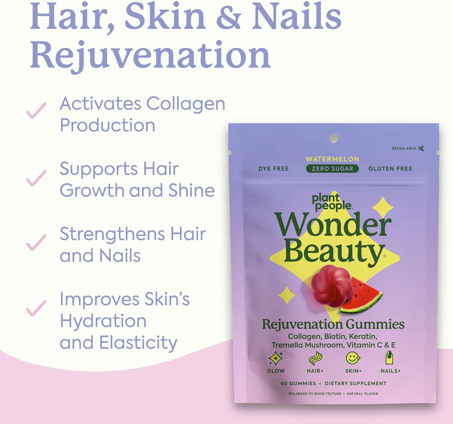 - Get the Glow: Wonderbeauty Gummies are expertly crafted with a blend of biotin, Vitamin C, Vitamin E, and zinc to support healthy hair, radiant skin, and strong nails. These potent, plant-based gummies help stimulate collagen production, visibly improving skin elasticity and reducing the appearance of fine lines.
