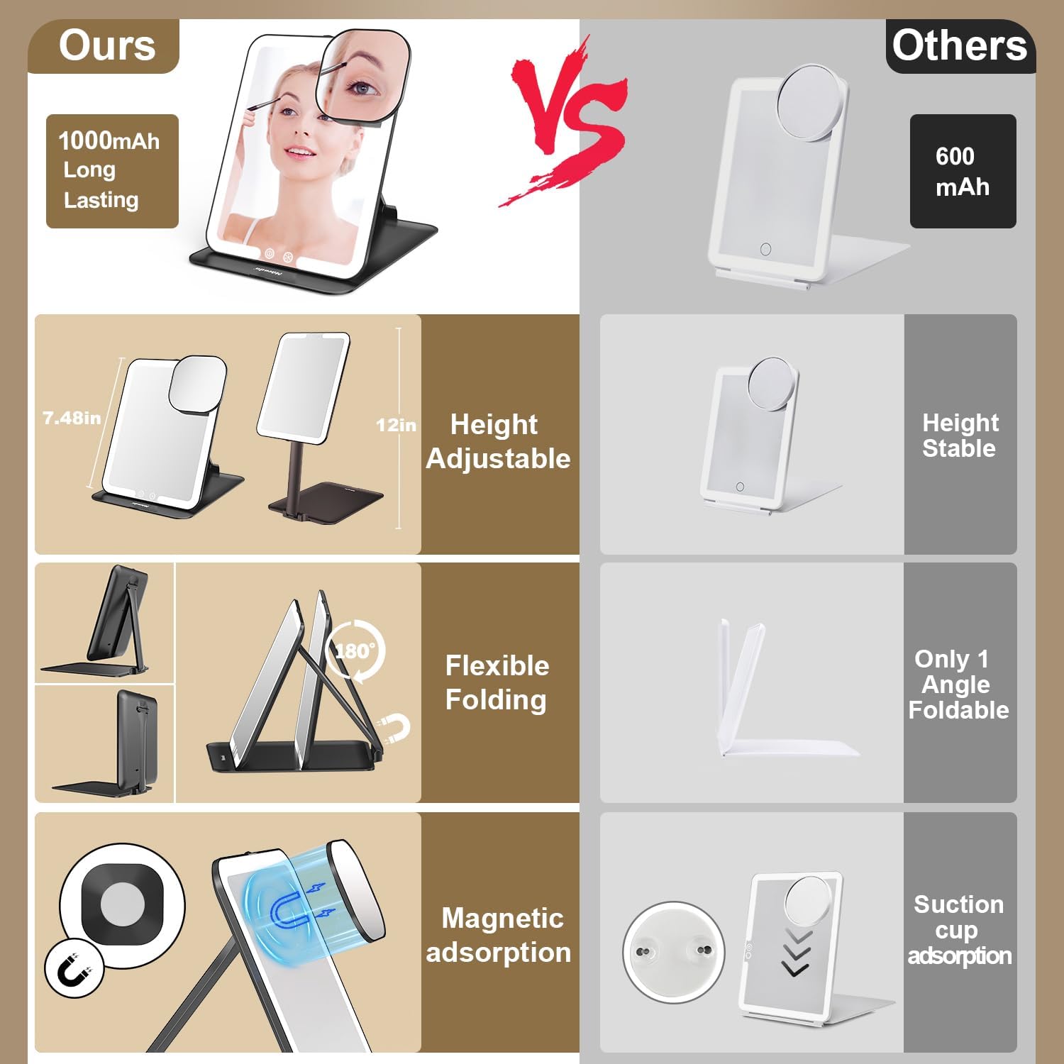 - đăTripple Folding & 180° Adjustable with Angle SensorăThe scientifically designed 180° rotatable and back and forth movable adjustable base can be adjusted in height and angle according to the usage demand. Auto Turn on when angle >30°, turn off when angle <30°. When there is no operation for 30 minutes, the mirror will automatically switch off to save power. Memory function: it will automatically restore the last light mode.