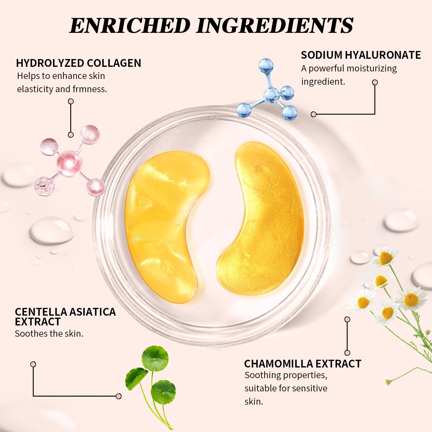 - Anti-Aging Power: Infused with Hydrolyzed Collagen, 24K nano gold, Glycerin, and hyaluronic acid, our eye patches help prevent wrinkles, firm and tighten skin, and reduce sagging. Botanical extracts like centella asiatica and licorice root soothe and revitalize for a youthful, radiant look.