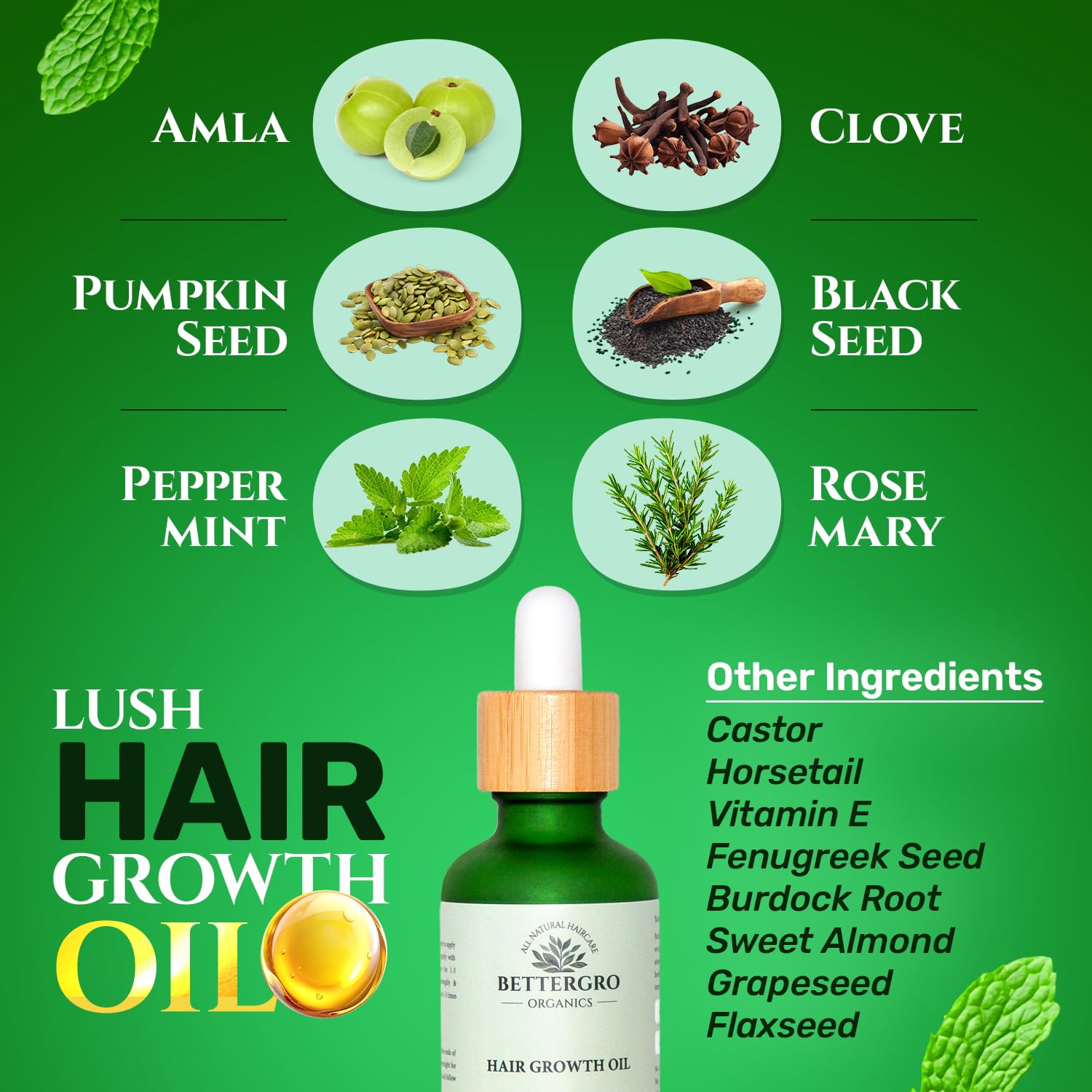 BetterGRO Organic Hair Growth Oil – Herbal & Natural Blend with Rosemary, Black Seed, Amla, Pumpkin Seed & More – Supports Growth, Strengthens Roots, Vegan & Cruelty-Free (1.7 fl oz)