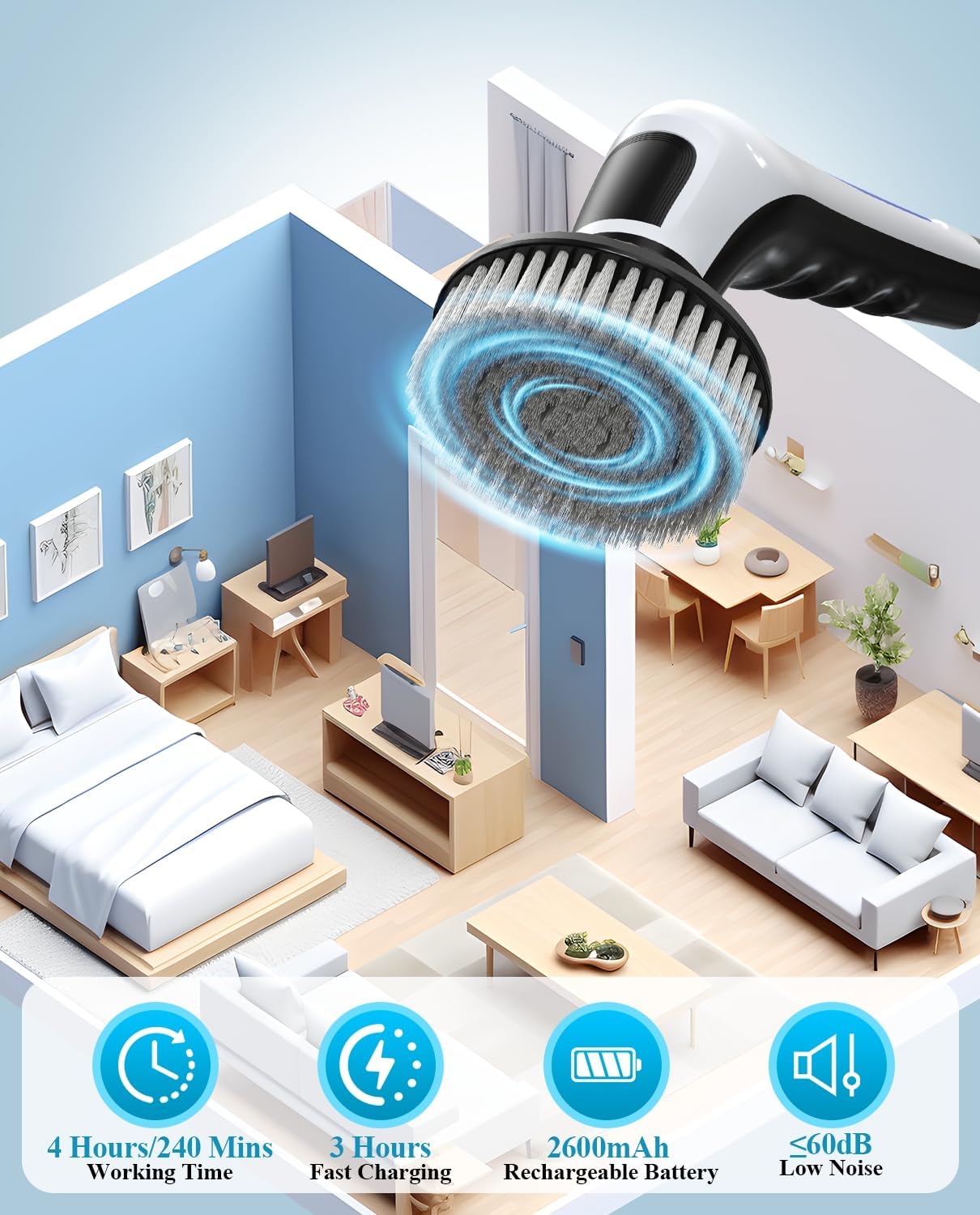 - UPGRADED Household Cleaning Brushes - 3 Adjustable Speeds (350/380/420RPM) / Extendable and Detachable Handle / Digital Display Screen / 9 Replaceable Brush Heads / IPX7 Waterproof / Type-C Charging Port / 240 Mins Working Time / 3 Hours Fast Charging Low Noise ≤60dB / Brush Storage Bag & Hook
