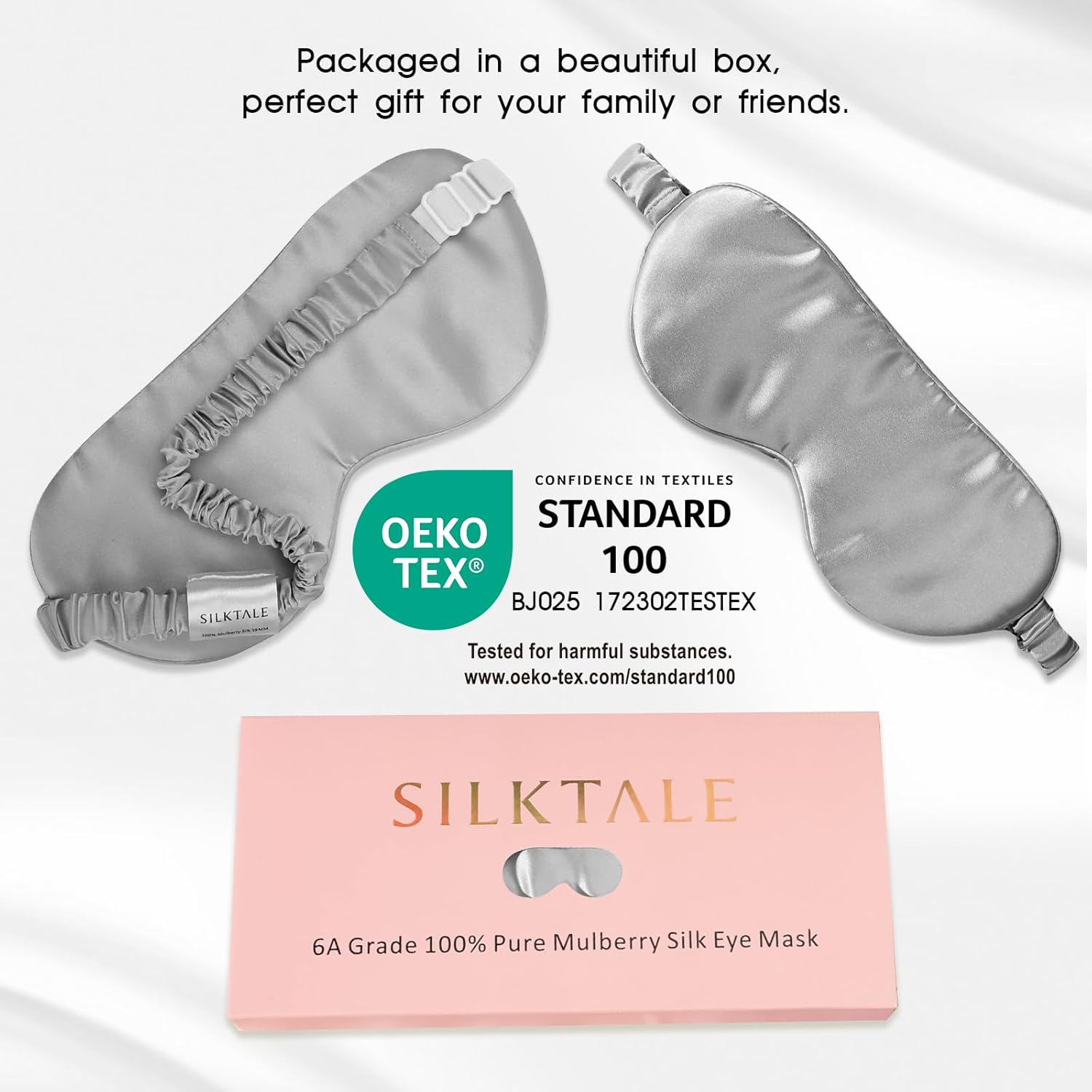 - SILKTALE sleep eye mask is made of 100% Grade 6A 19 momme Pure Mulberry Silk. Our silk is granted the OEKO-TEX STANDARD 100 certification, which is certified to be free of chemicals and colored with environmentally-safe dyes.