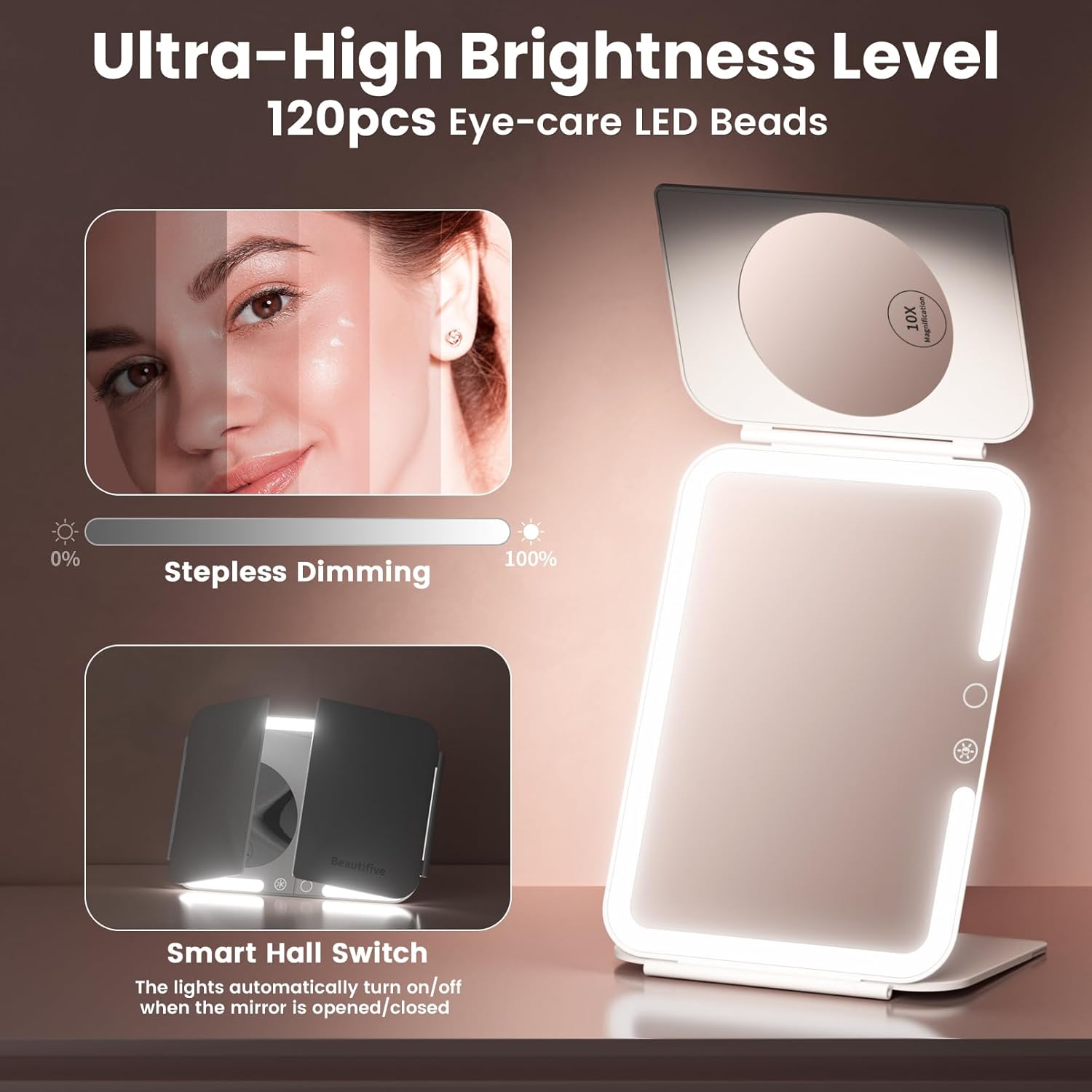 - Precision 1X/3X/10X Magnification: Beautifive travel mirror with light includes 1X, 3X and 10X magnifying mirrors for everything from full-face makeup to close-up detailing like eyeliner or tweezing. The large mirror surface ensures a clear, comprehensive view for flawless results every time.
