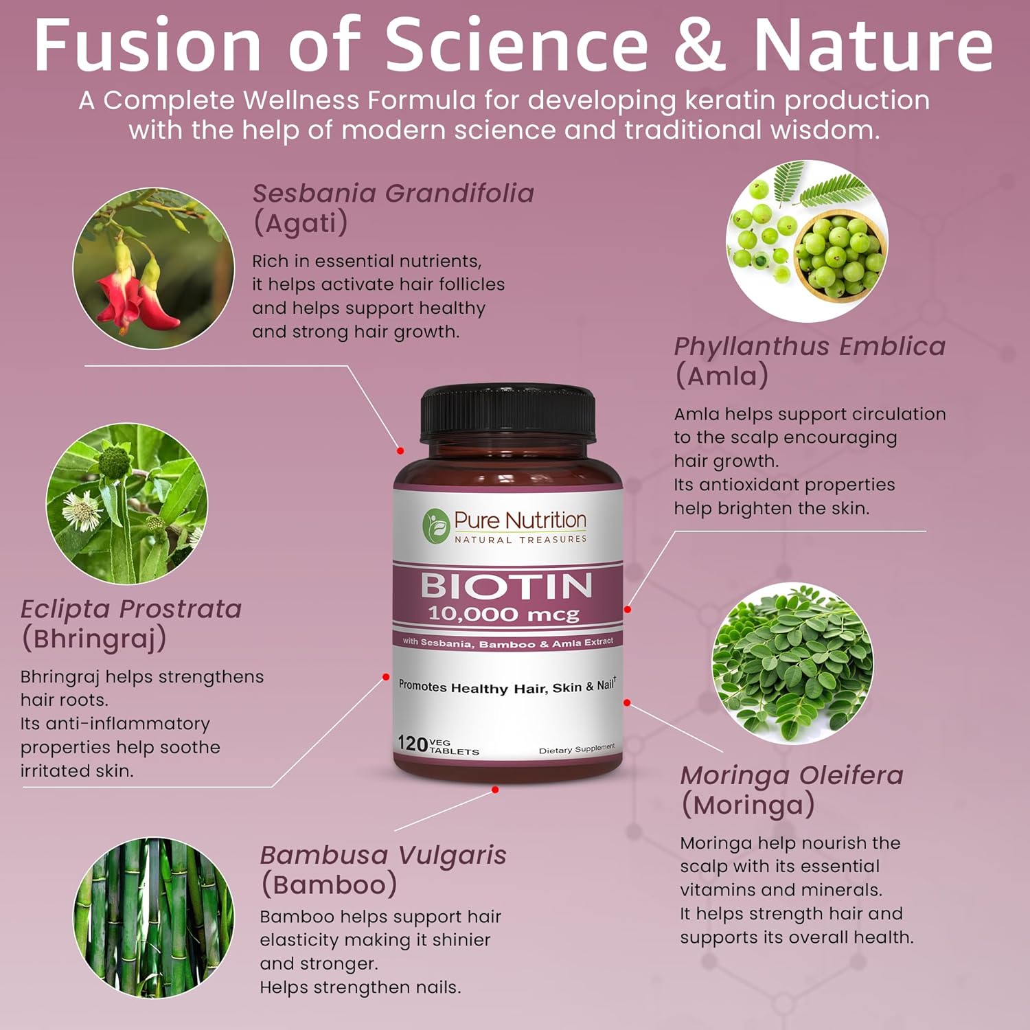 - "PURE NUTRITION BIOTIN contains vitamin B7 and a blend of natural extracts essential for keratin production. Each serving combines Biotin with herbal ingredients like Sesbania, Bhringraj, Bamboo Shoot, Amla, Moringa, and more that provide natural Biotin. This unique formulation supports the functions of Biotin for hair and skin. Regular use of these Biotin tablets helps maintain the overall health of your hair, skin, and nails. "