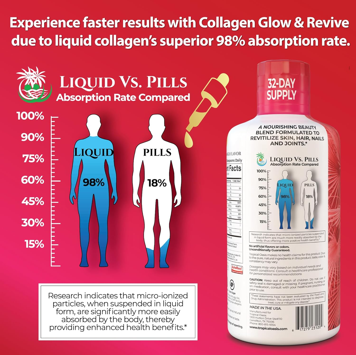 - QUALITY YOU CAN TRUST - Tropical Oasis Liquid Collagen does not contain any fillers, is Non-GMO, Gluten Free, and Sugar Free. All Tropical Oasis products are proudly made in the USA in a GMP Certified Facility.