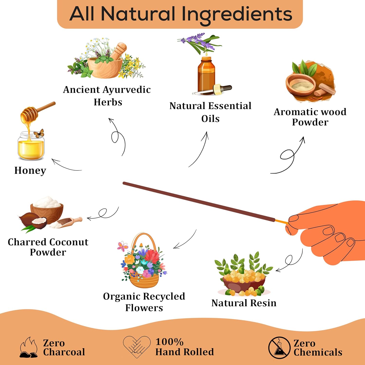 - 100% NATURAL Natural incense Sticks completely handmade MADE FROM SCRATCH by blending natural resins, Herbs, Spices with aromatic wood powders, charred coconut powder fragrant oils and honey.No Dipping in Toxic Chemicals.