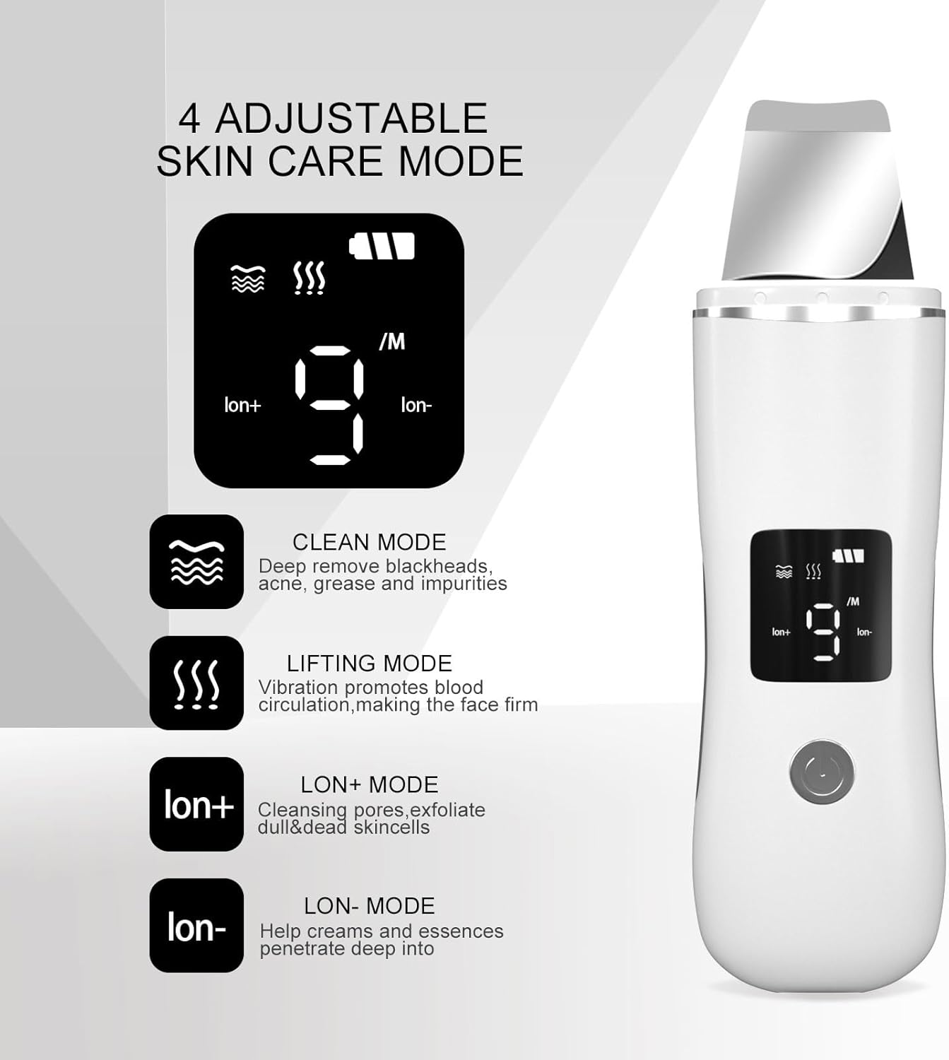 - Usage Steps - Begin with "Cleaning and Ion+ mode" using a cleanser or toner for deep cleansing. Follow with "Ion-" mode to enhance the application of creams and oils. Finish with "Lifting mode" to massage and complete your skincare routine.