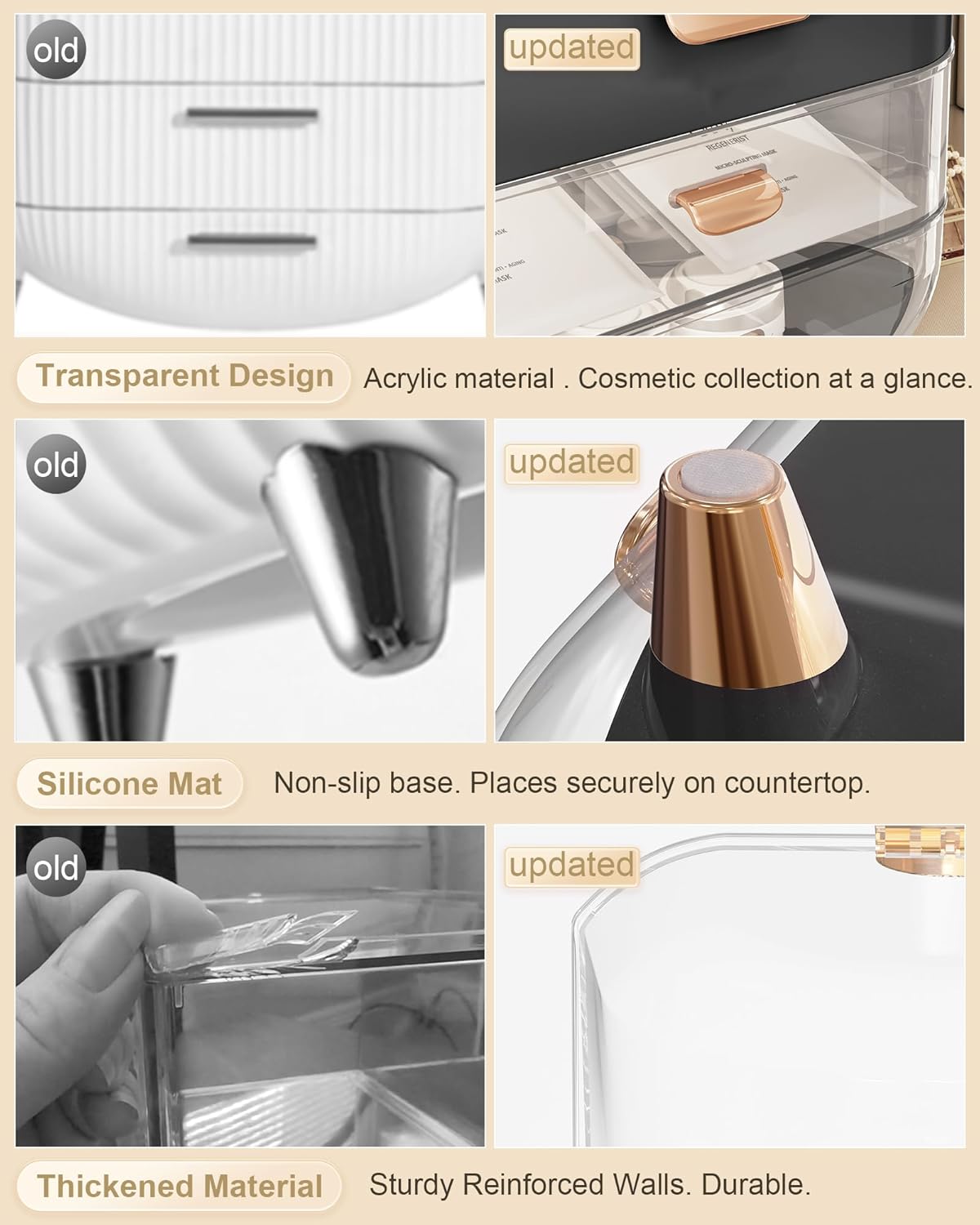 - đăThickened Material & Non-slipăReinforced and upgraded handle won't fall off. Easily move the skin care organizer to anywhere. The countertop organizer is made of thickened ABS material, which is stronger and more durable than normal ones. Drawer and clear top are able to open and close easily. Rubberized bottom, non-slip and won't scratch desktop.