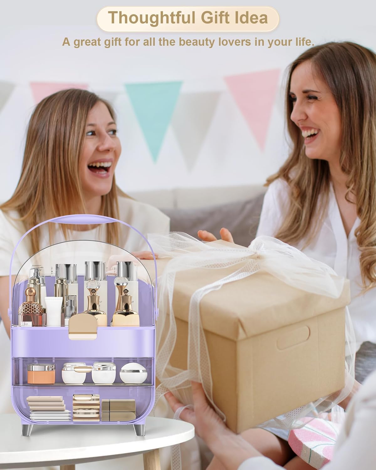 - đăStylish and ElegantăBeautiful rounded appearance. Adopting professional top design, suitable for any home and women's style. This makeup box is elegant on vanity, bedroom, dresser, countertop, bathroom. Delicate colour is suitable for any room decoration.