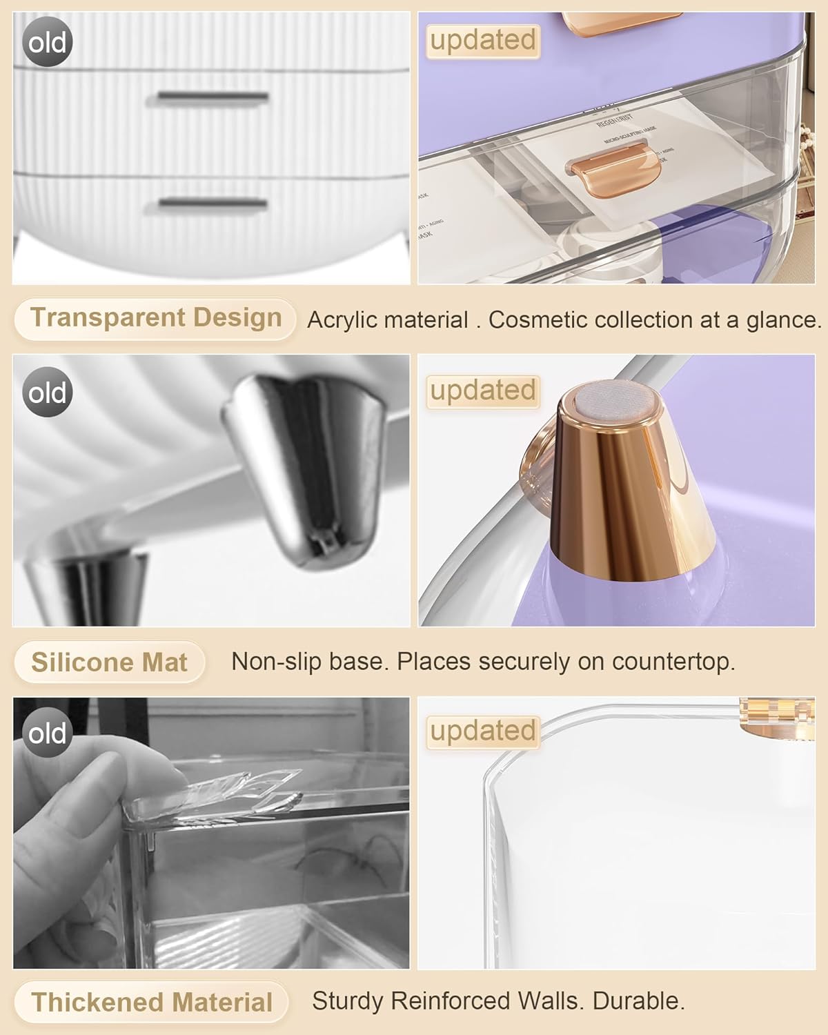 - đăThickened Material & Non-slipăReinforced and upgraded handle won't fall off. Easily move the skin care organizer to anywhere. The countertop organizer is made of thickened ABS material, which is stronger and more durable than normal ones. Drawer and clear top are able to open and close easily. Rubberized bottom, non-slip and won't scratch desktop.
