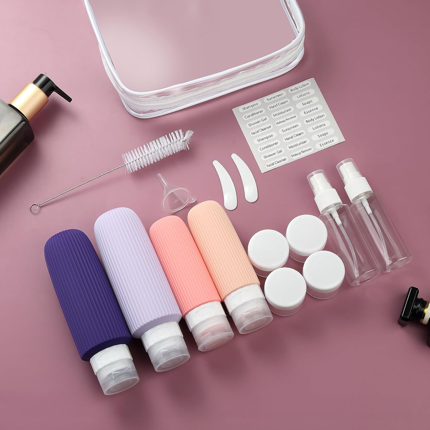 - Useful Travel Accessories: This is a oversize assortment of travel containers in a useful zip case. ( Come in 2 pcs Larege 6oz & 2pcs 3oz Travel Bottles + 4 Travel Jar s+ 2 Spray Bottles + 2 Scoopers + 1 Funnel + 1 Clean Brush + 1 Page Label + 1 Clear Toiletry Bag ) Multiple ones allow you take along different beauty products and toiletries according to your requirement