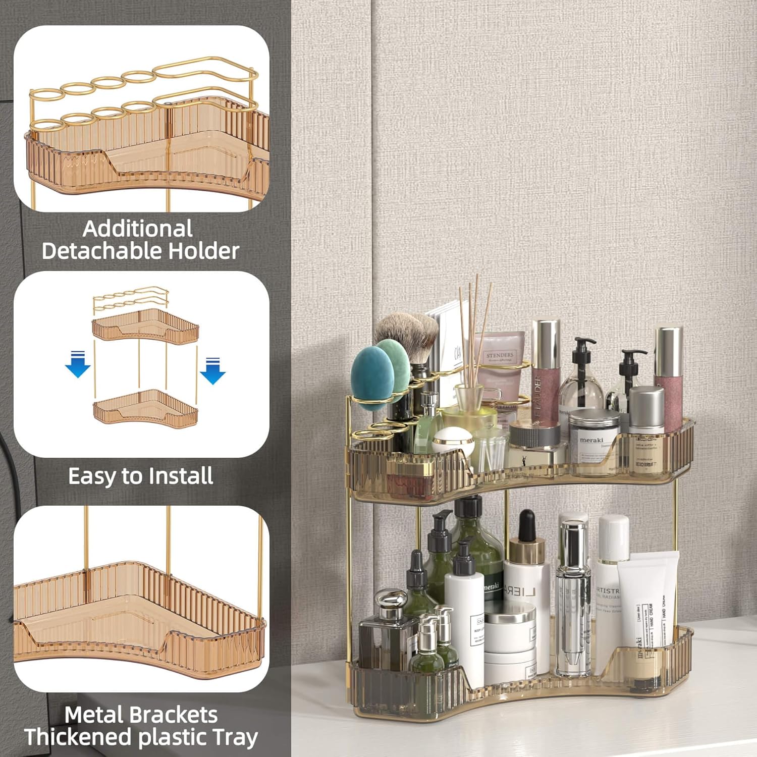 - ăMakeup Organizer Countertop With Brush HolderăThe corner bathroom countertop organizer has a new compartmentalized metal holder at the top, which not only organizes makeup brush beauty egg , but also toothbrushes and more!