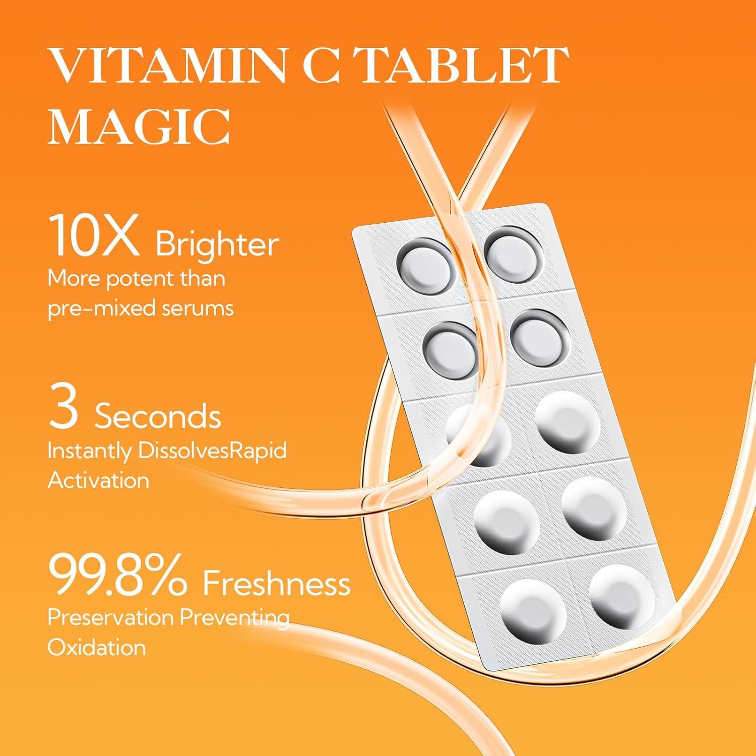 - REVOLUTIONARY VITAMIN C SERUM:This skin brightening serum is designed to visibly reduce hyperpigmentation and sunspots while soothing irritated or uneven skin. Powered by stable 3-O-Ethyl Ascorbic Acid (a highly effective form of Vitamin C), it helps inhibit melanin production, diminish dark spots, and brighten dull, fatigued skin. Stored in freeze-dried tablets to ensure each dose is ultra-fresh and maximally effective.