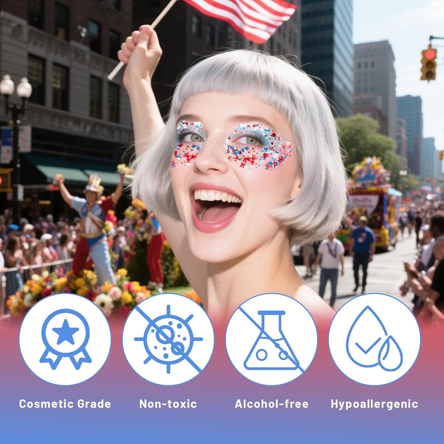 - Expressing Patriotic Feelings:Create the perfect finishing touch to your 4th of July outfit with this red white blue body glitter. Ideal for patriotic events, 4th of July celebrations, President's Day, international competitions, parades, the striking flag makeup expresses patriotism for your country.