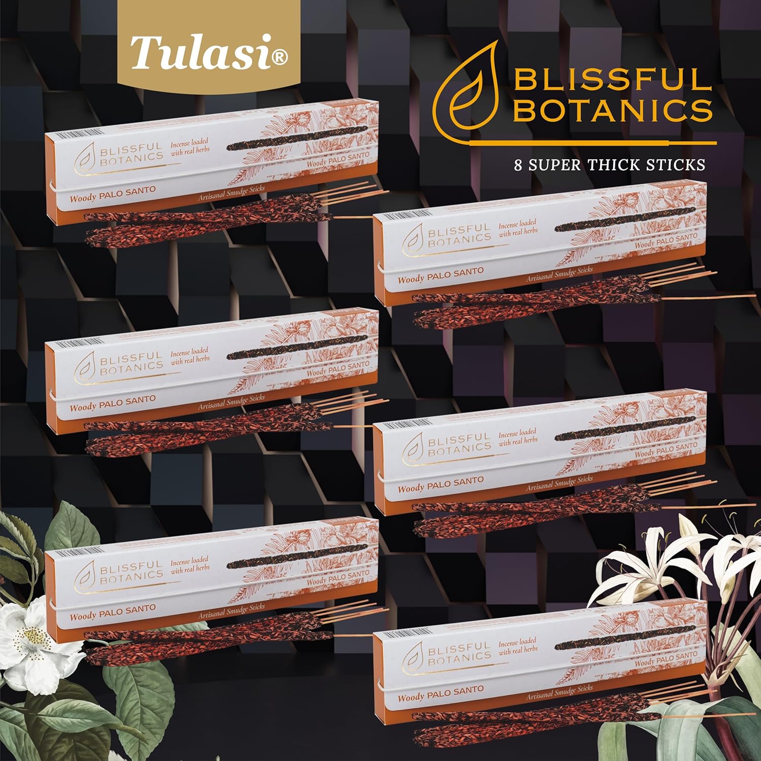 Tulasi Palo Santo Smudge Incense Sticks Pack – 48 Natural Smudge Sticks (6 Boxes x 8) | Long Burning (55 Min) | Aromatherapy, Spiritual Cleansing, Meditation, Mood Lifting, Air Purifying Incense