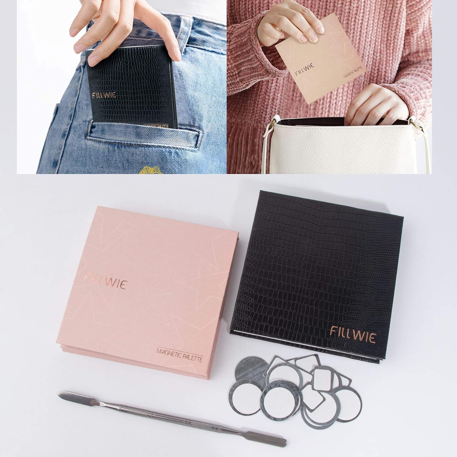 - Accessory Details: Comes with a mirror, long spatula (15.7 cm/6.18 in), and 10 round and 10 square metal stickers for non-magnetic pans. Mirror is secured at the palette’s bottom for easy use