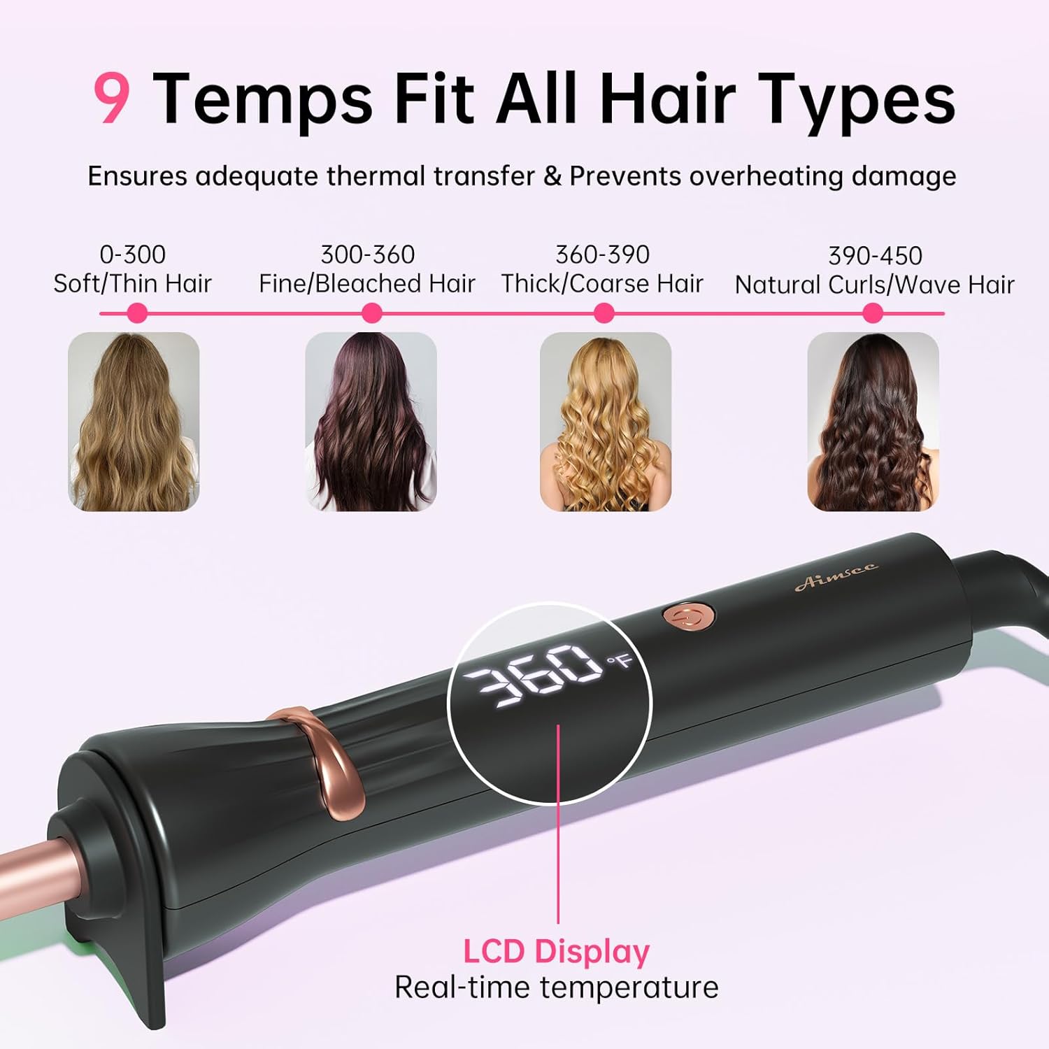 - Flexible Styling with 9 Temp Control: Featuring 9 adjustable temperatures (300-450°F), this skinny curling iron adapts to fine, thick, or heat-sensitive hair. The 2.5m 360° swivel cord ensures flexibility during styling, making it easy to reach all areas without tangling. Beginners can start at low heat and gradually increase – match settings to achieve the desired effect, whether that be tight curls or soft, undone waves.
