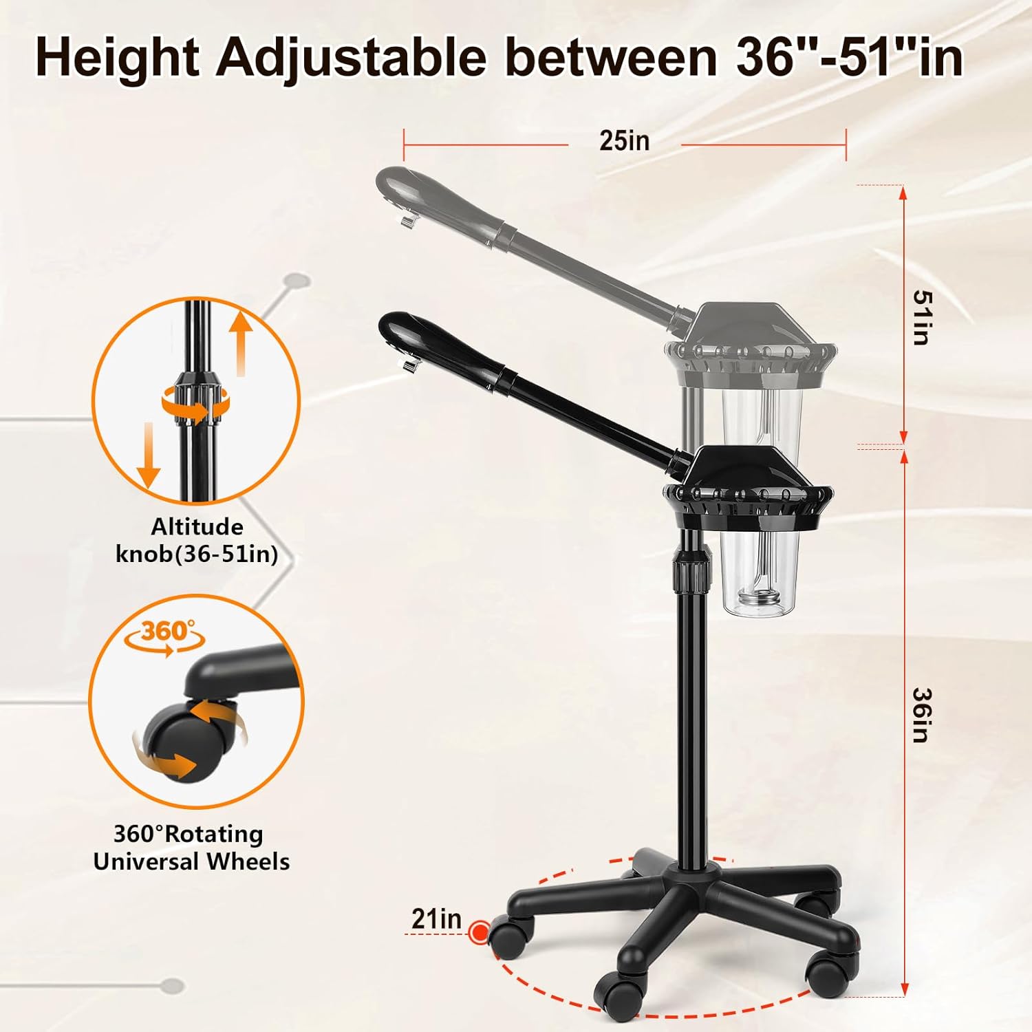 - 【Facial steamer adjustable】The height of the steamer facial can be adjusted from 36 to 52 inches (nozzle and body can be rotated 360°) to meet your needs.