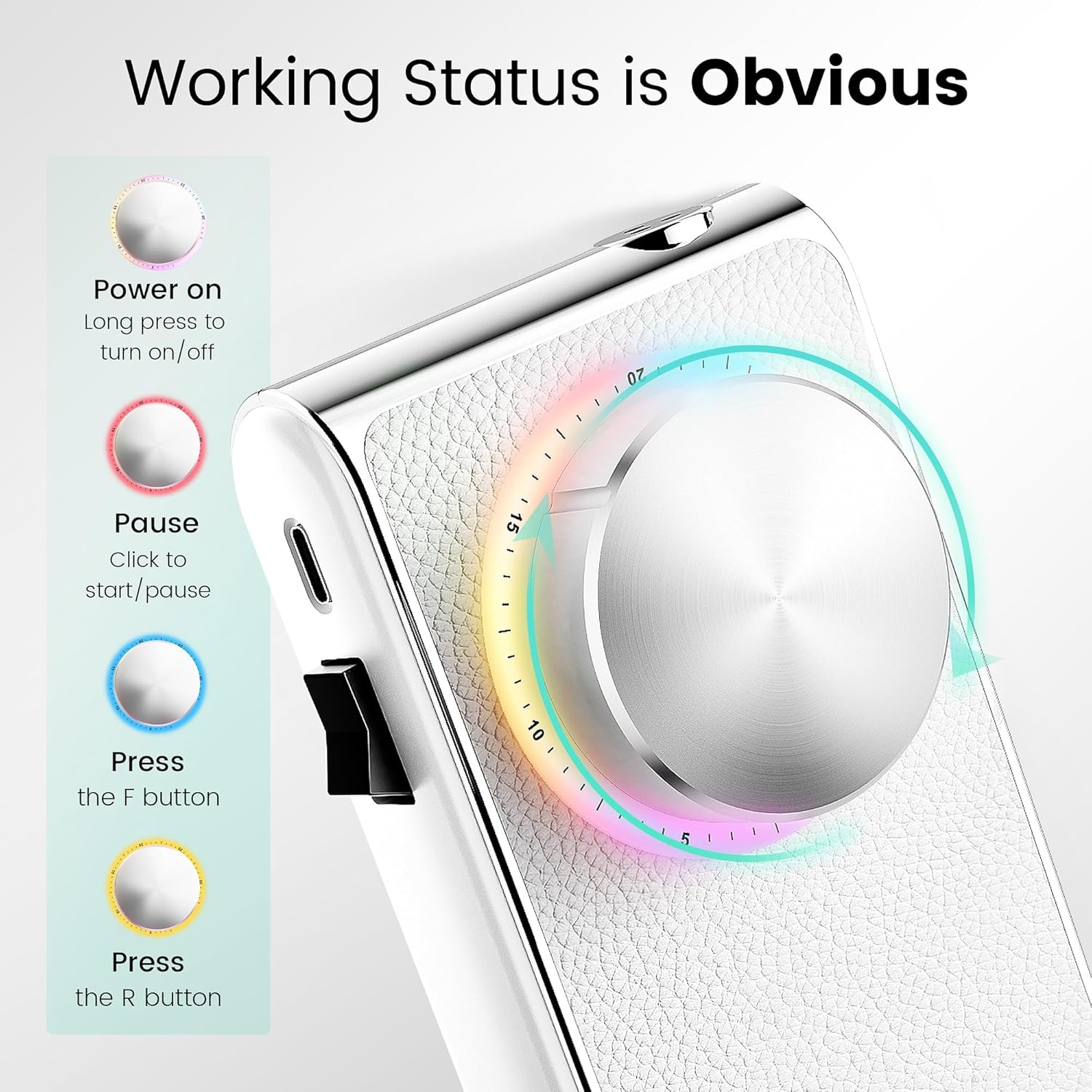 - 【Rainbow Light Turntable Design】Aviation cluminum knob, flexible control, the light color changes according to the working status(four colors). The ergonomic handle is crafted with a special textured finish, providing a non-slip grip and comfortable handling during use.