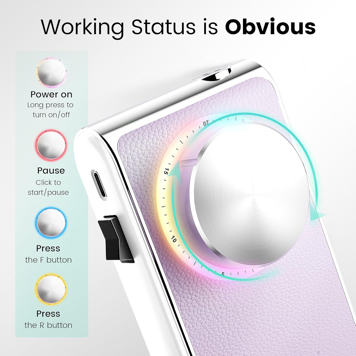 - 【Rainbow Light Turntable Design】Aviation cluminum knob, flexible control, the light color changes according to the working status(four colors). The ergonomic handle is crafted with a special textured finish, providing a non-slip grip and comfortable handling during use.