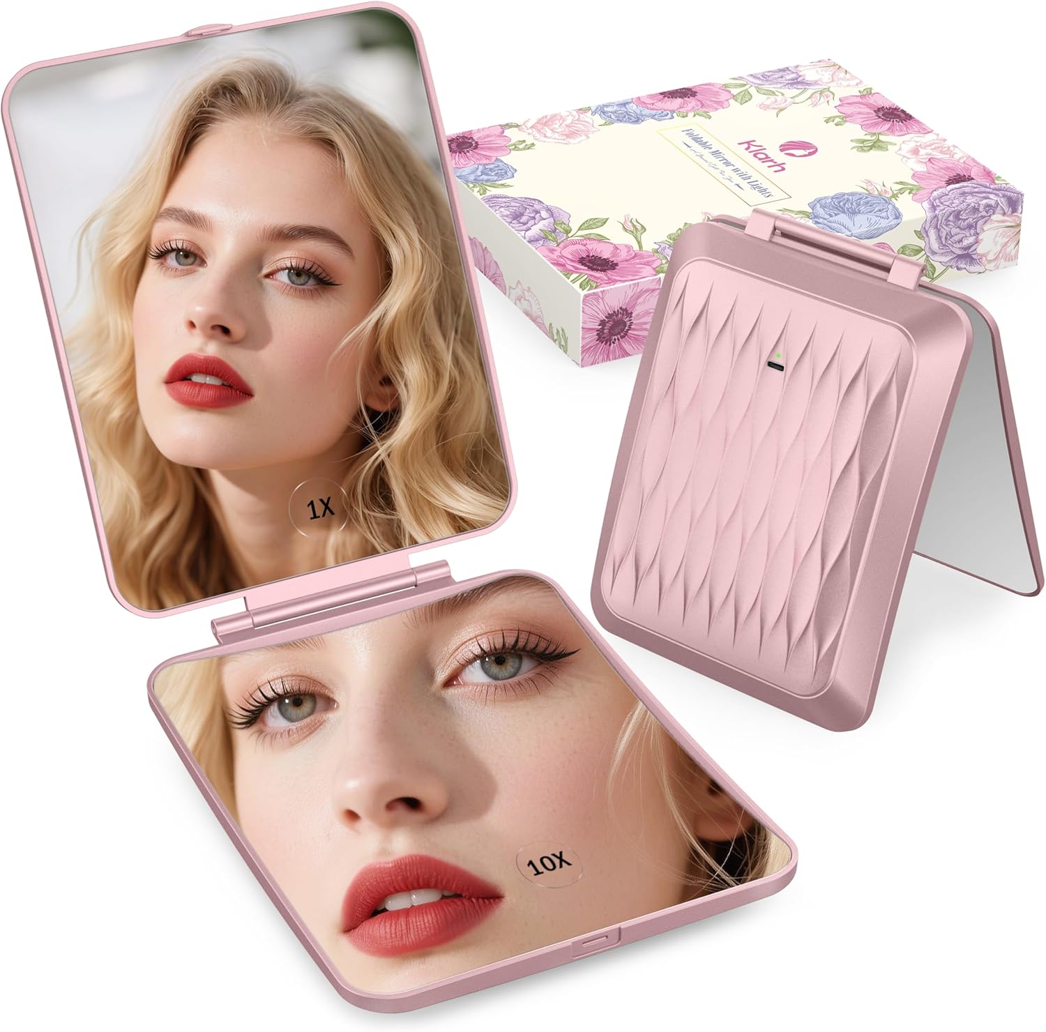 1X/10X Magnifying Makeup Mirror with 3 Colored Lights and Touch Control, 2700mAh Rechargeable LED Vanity Mirror for Home, Bathroom and Travel (Rose Pink, with LED Lights)