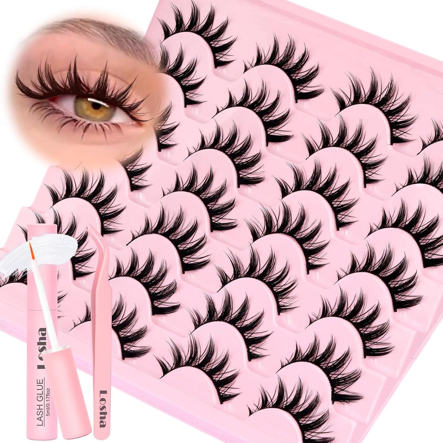 Losha Lashes Spiky Manga Lashes 14 Pairs Wispy False Eyelashes Natural Eye Lashes Kit with Lash Glue and Lash Tweezers Soft Anime Fake Eyelashes (Fairy)