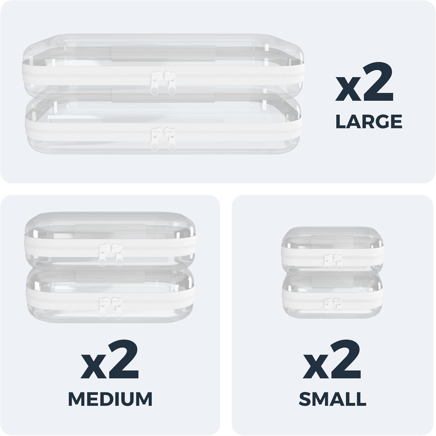 Extra Durable Mini Clear Hard Shell Zipper Case 6 Pack, 2x 12" Large, 2x 8" Medium, 2x 5" Small, Clear Travel Makeup Case, Hard Plastic Toiletry & Cosmetic Bag, Zippered Make Up Organizer Pouch